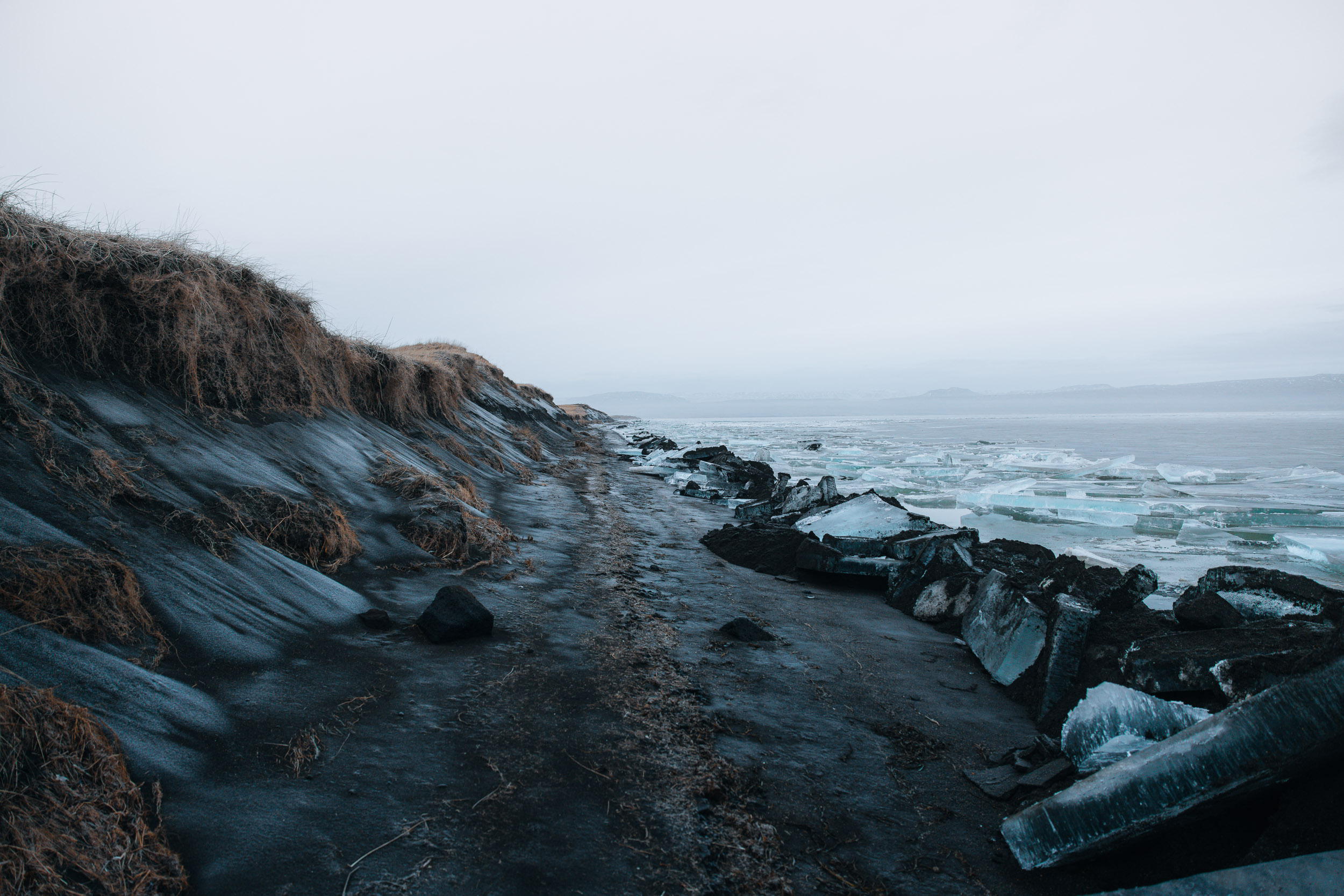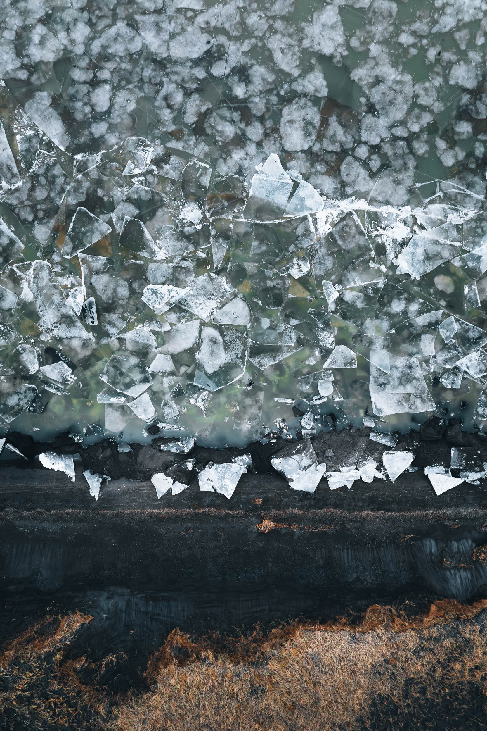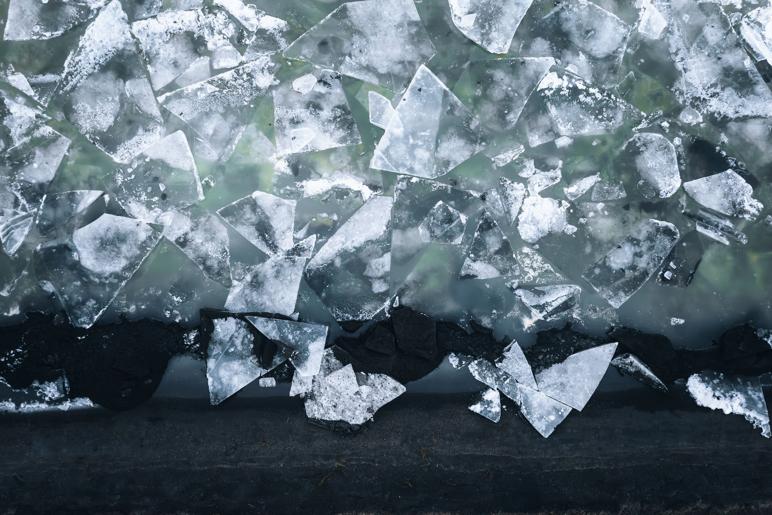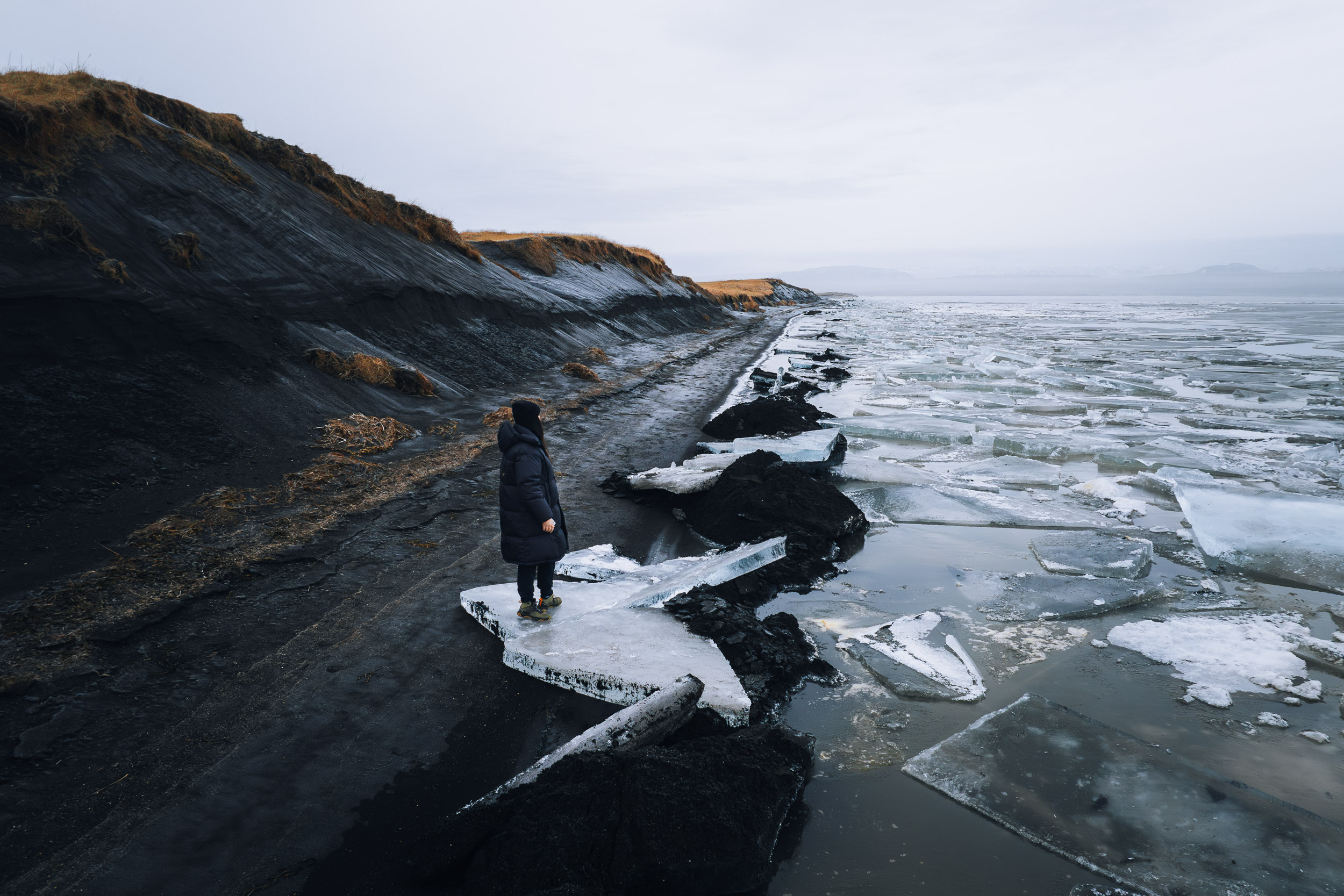This river froze over almost completely during a cold phase. As the temperature rose again, the ice broke into large chunks that floated to the banks and scattered across the beach, dragging the black sand with it and leaving behind this fascinating scene.