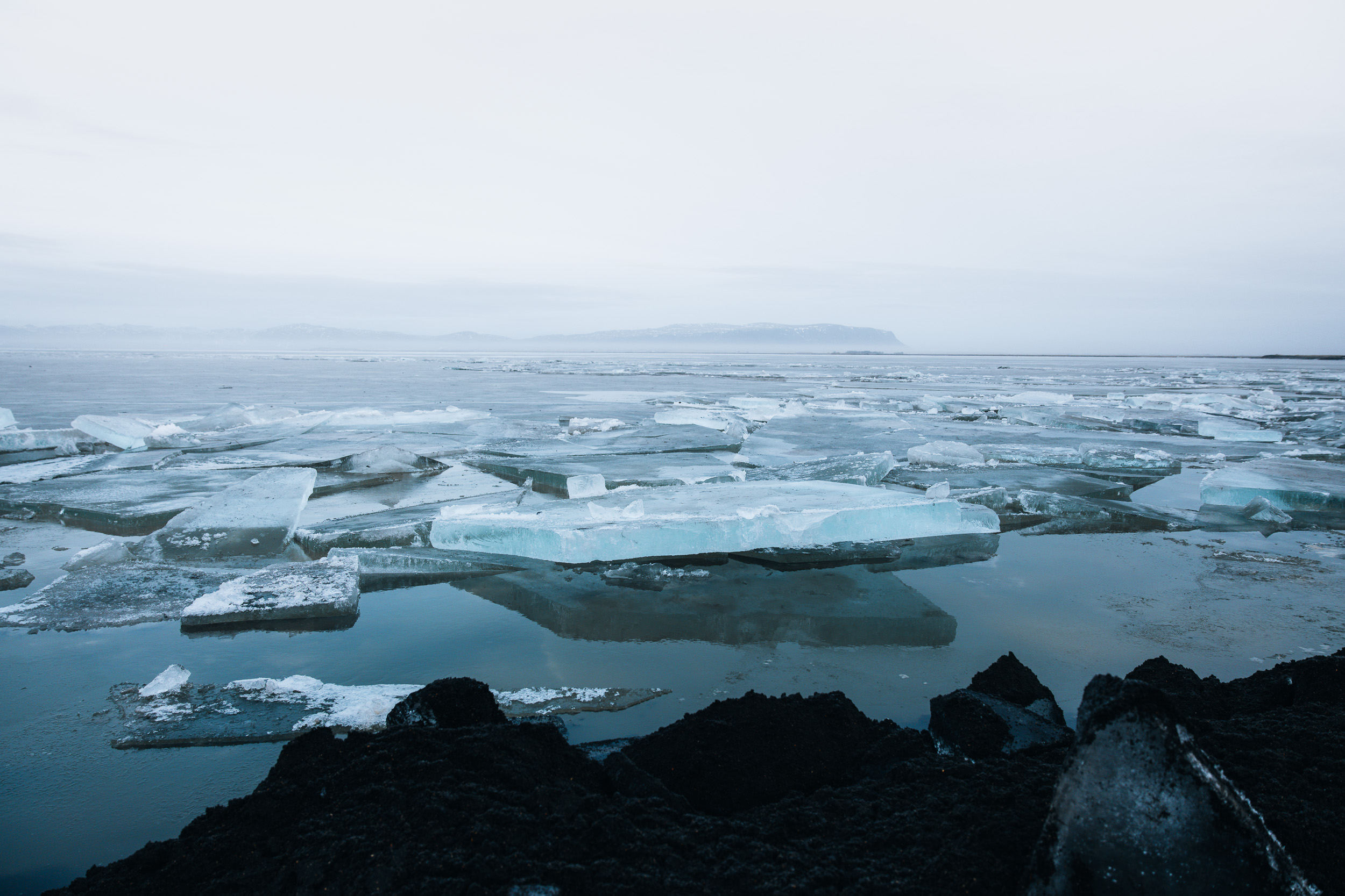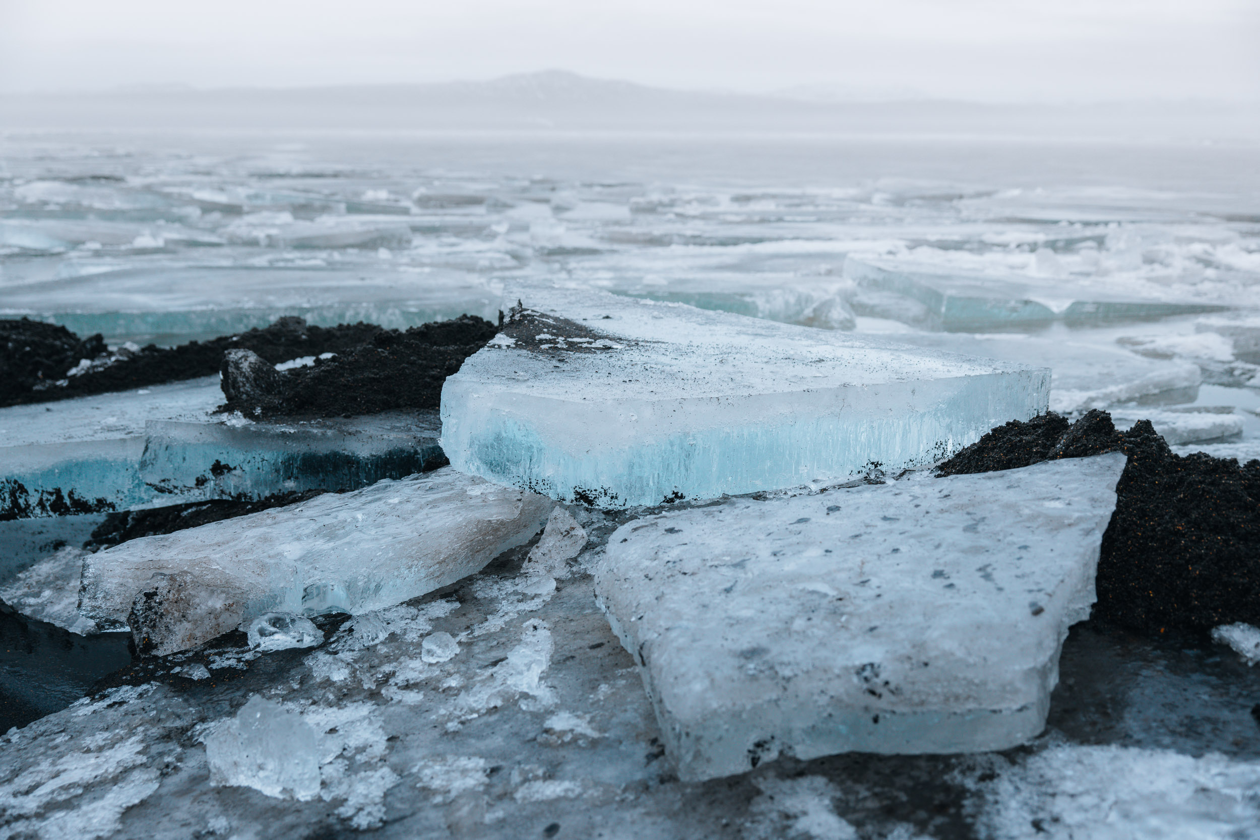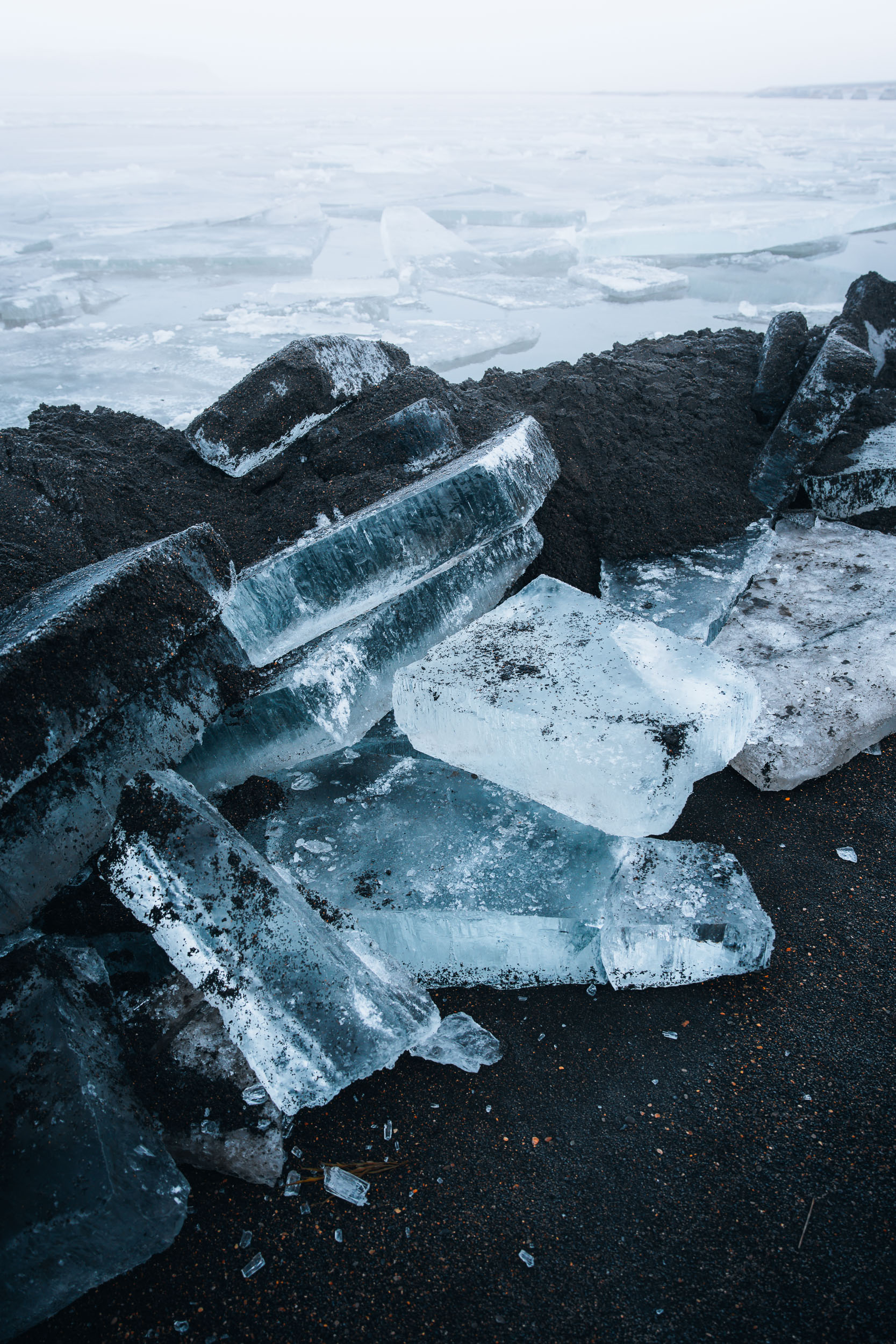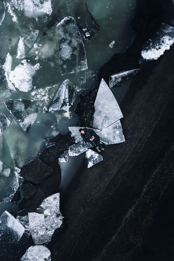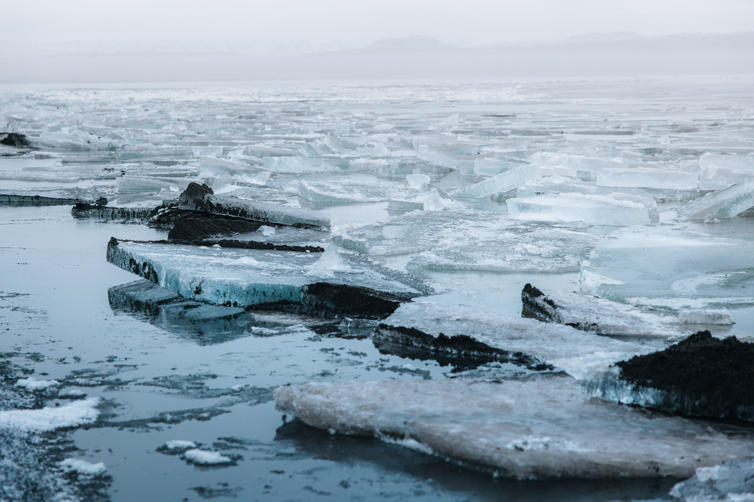 This river froze over almost completely during a cold phase. As the temperature rose again, the ice broke into large chunks that floated to the banks and scattered across the beach, dragging the black sand with it and leaving behind this fascinating scene.