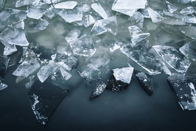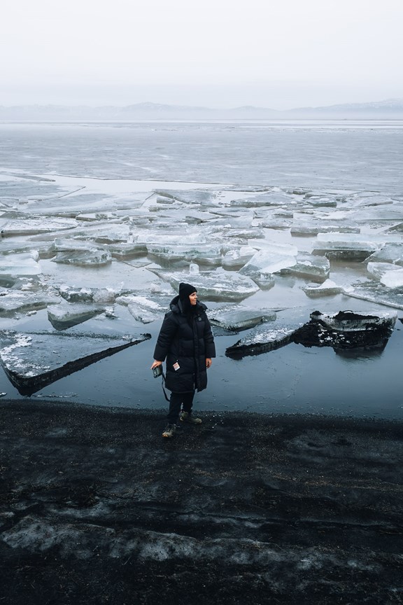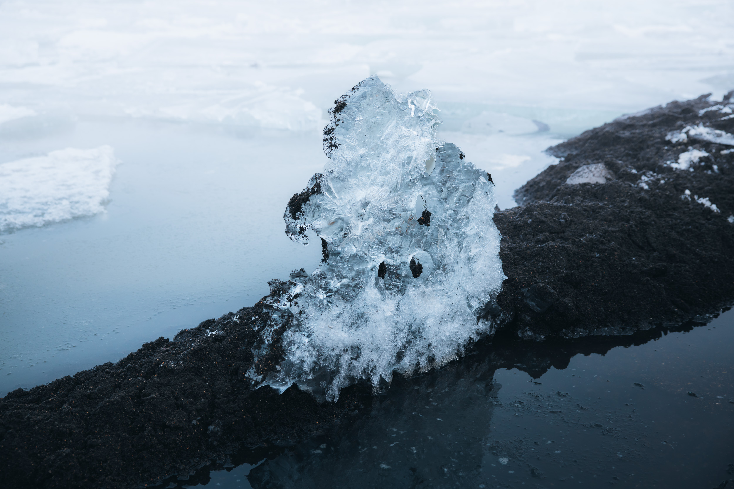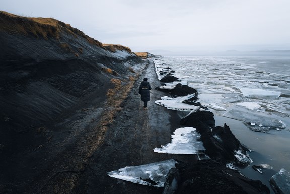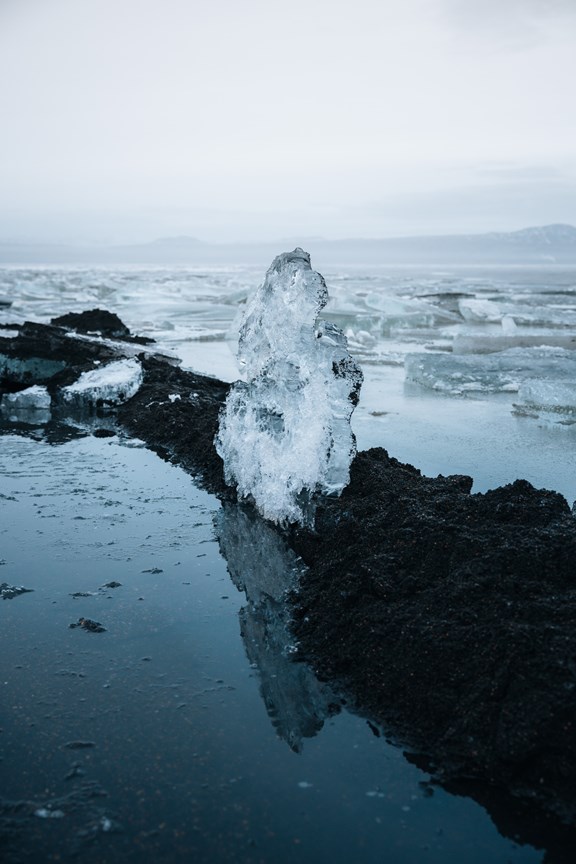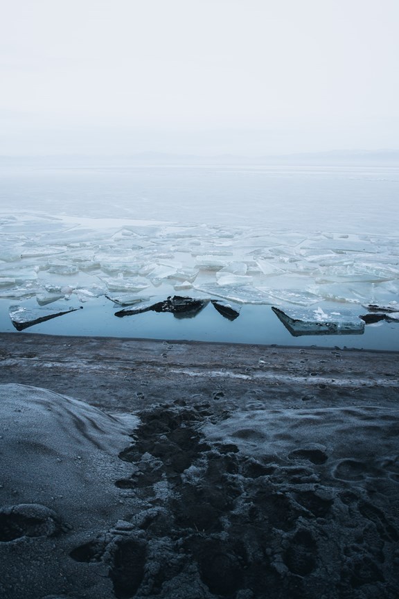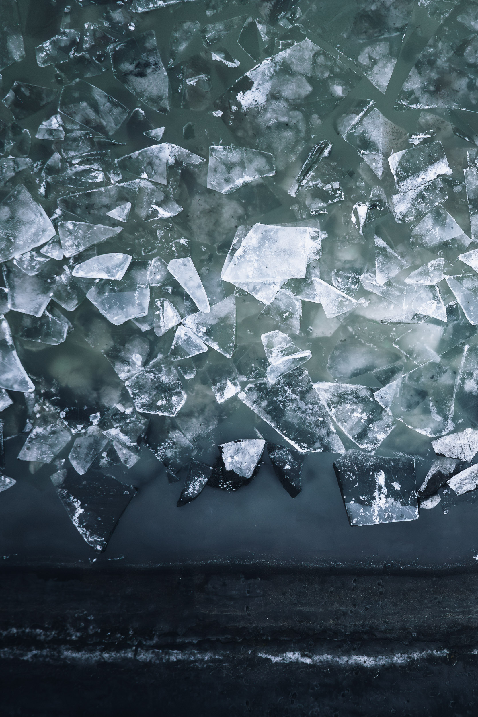 This river froze over almost completely during a cold phase. As the temperature rose again, the ice broke into large chunks that floated to the banks and scattered across the beach, dragging the black sand with it and leaving behind this fascinating scene.
