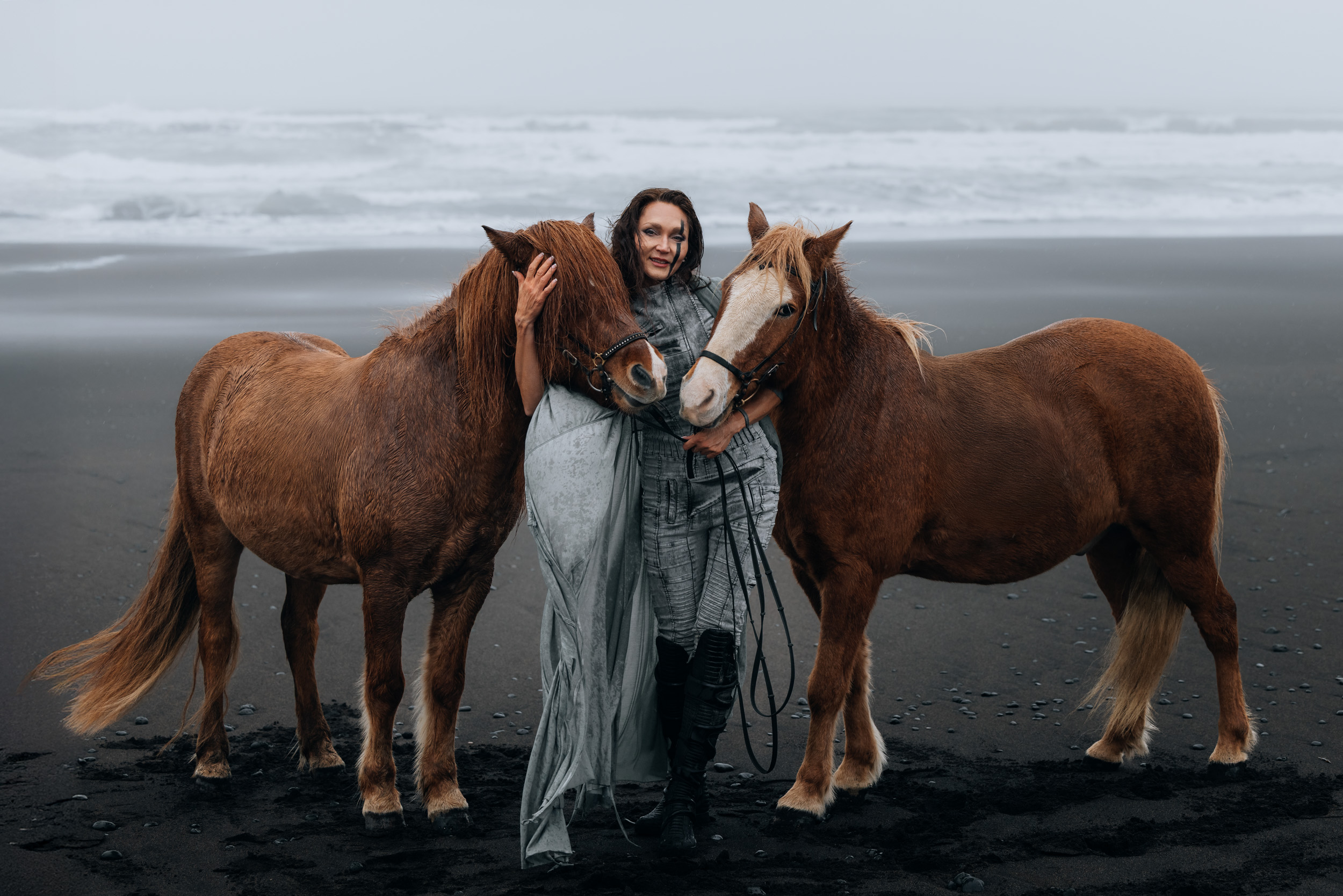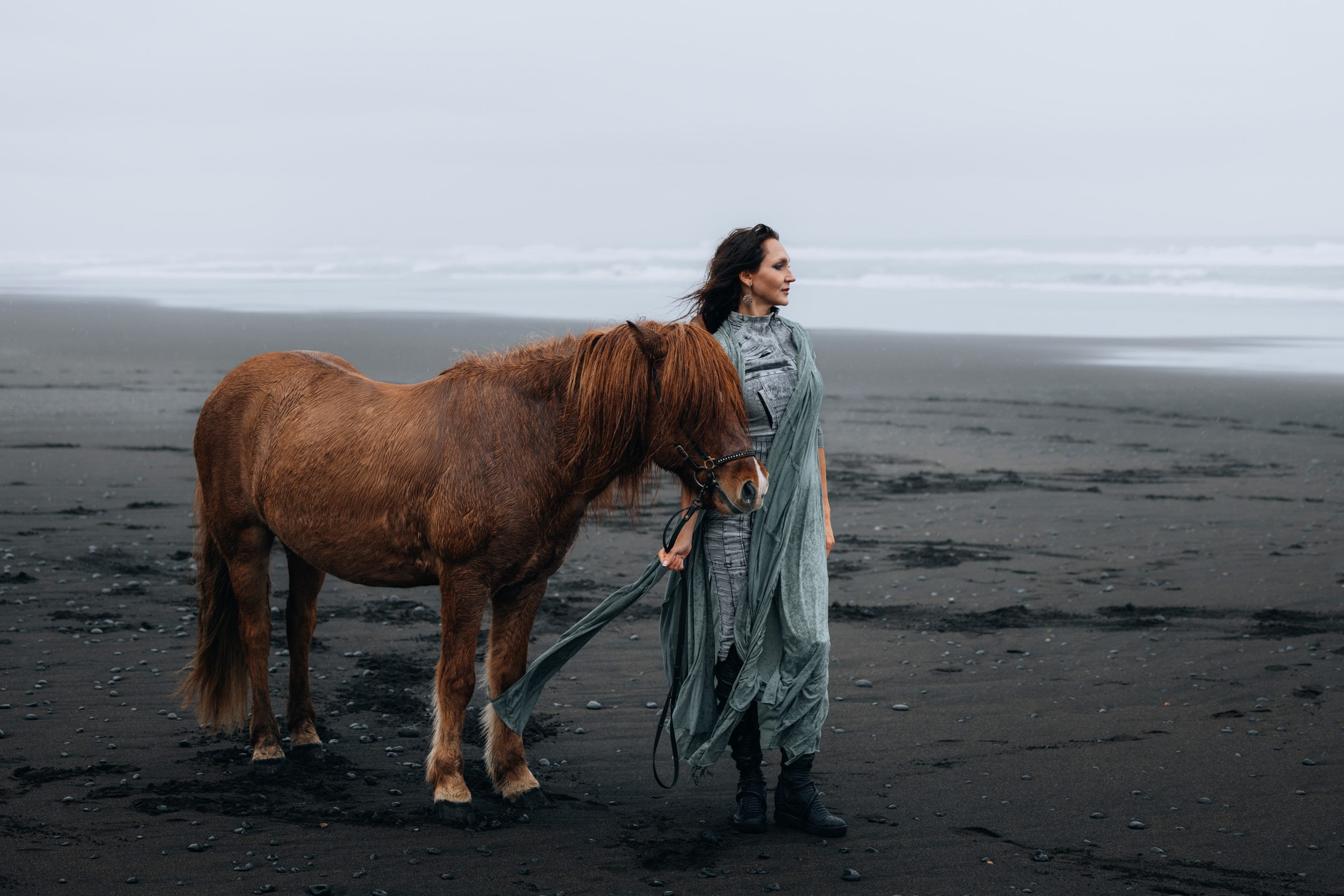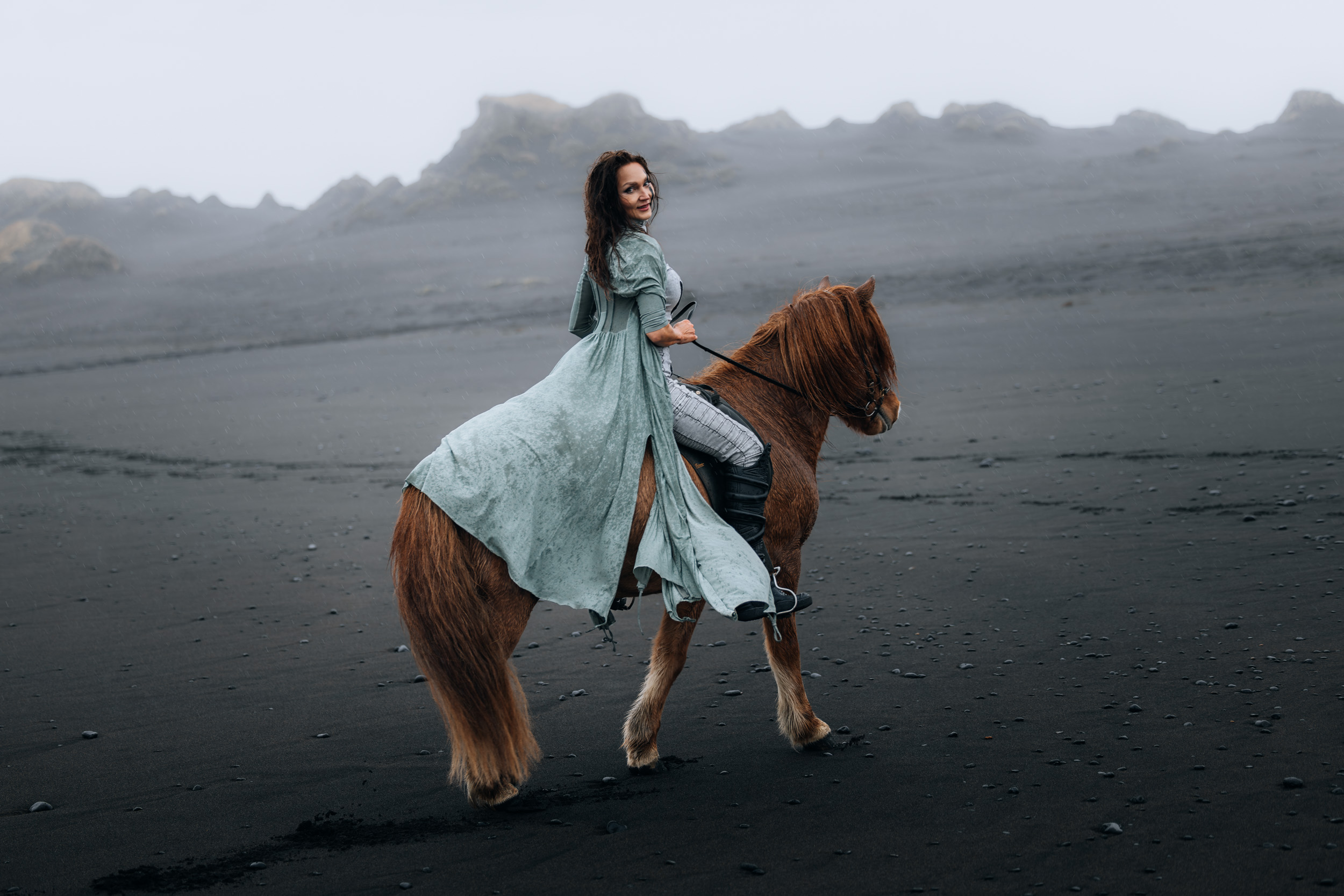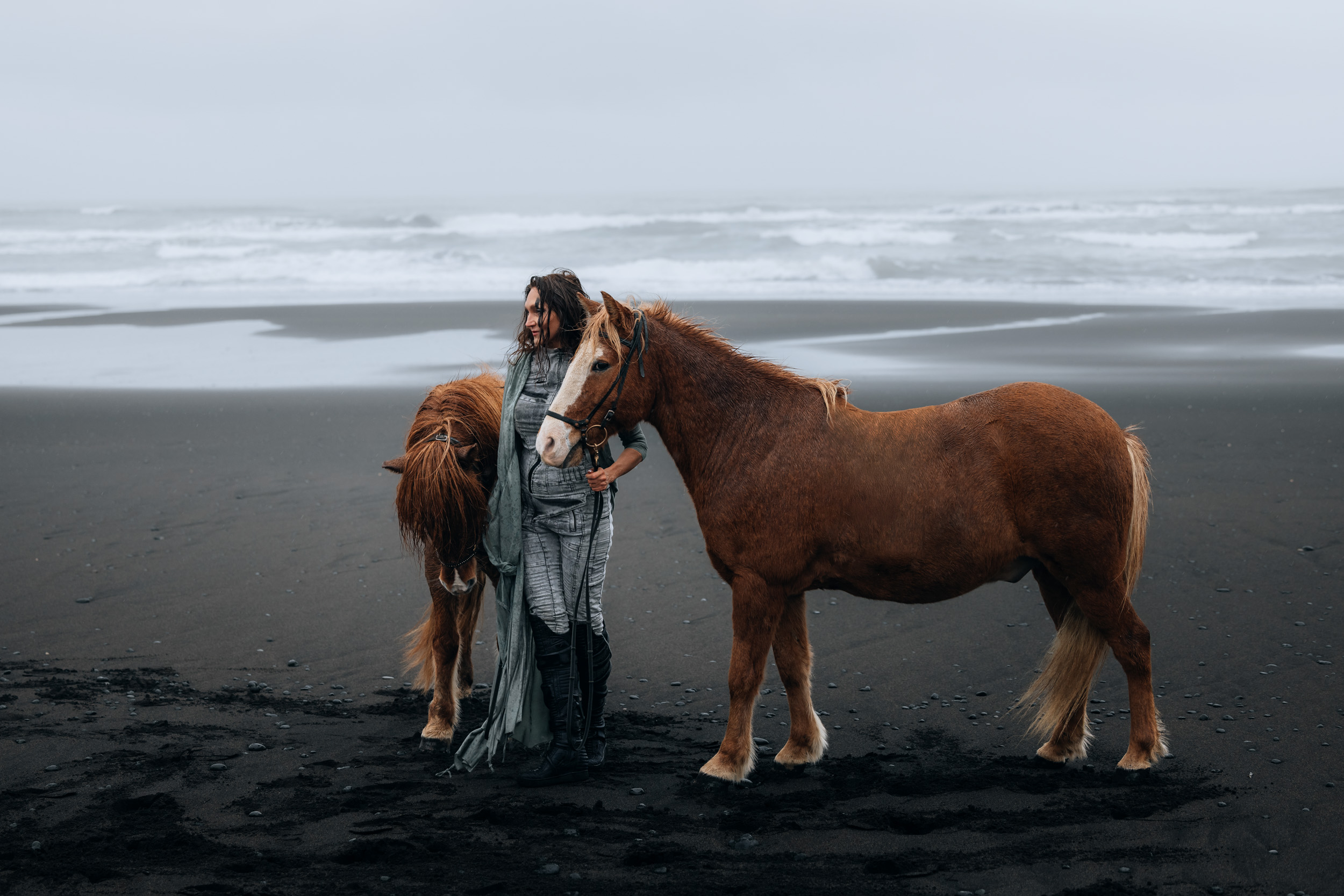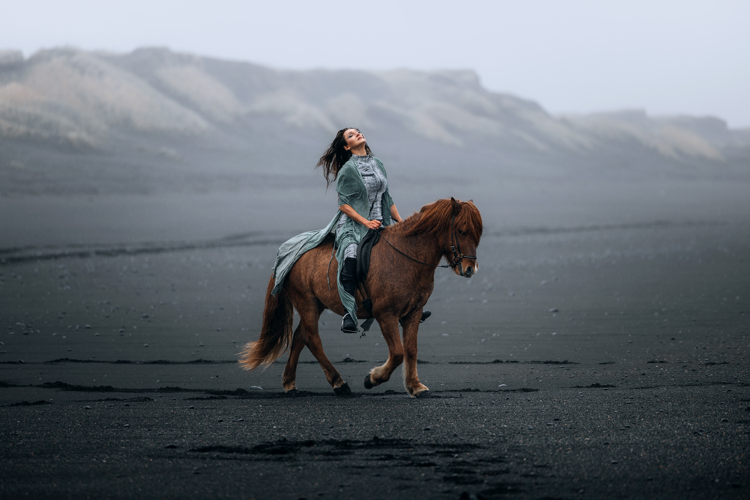Irene had the idea to capture herself horseback riding on a black beach. Iceland’s wide open spaces, dark sand, and changing weather make it a perfect place for this kind of shoot. That day, the weather quickly turned, and heavy rain came pouring down. But instead of stopping, the shoot carried on, and the rain ended up making everything look even better, real, powerful, and full of atmosphere.