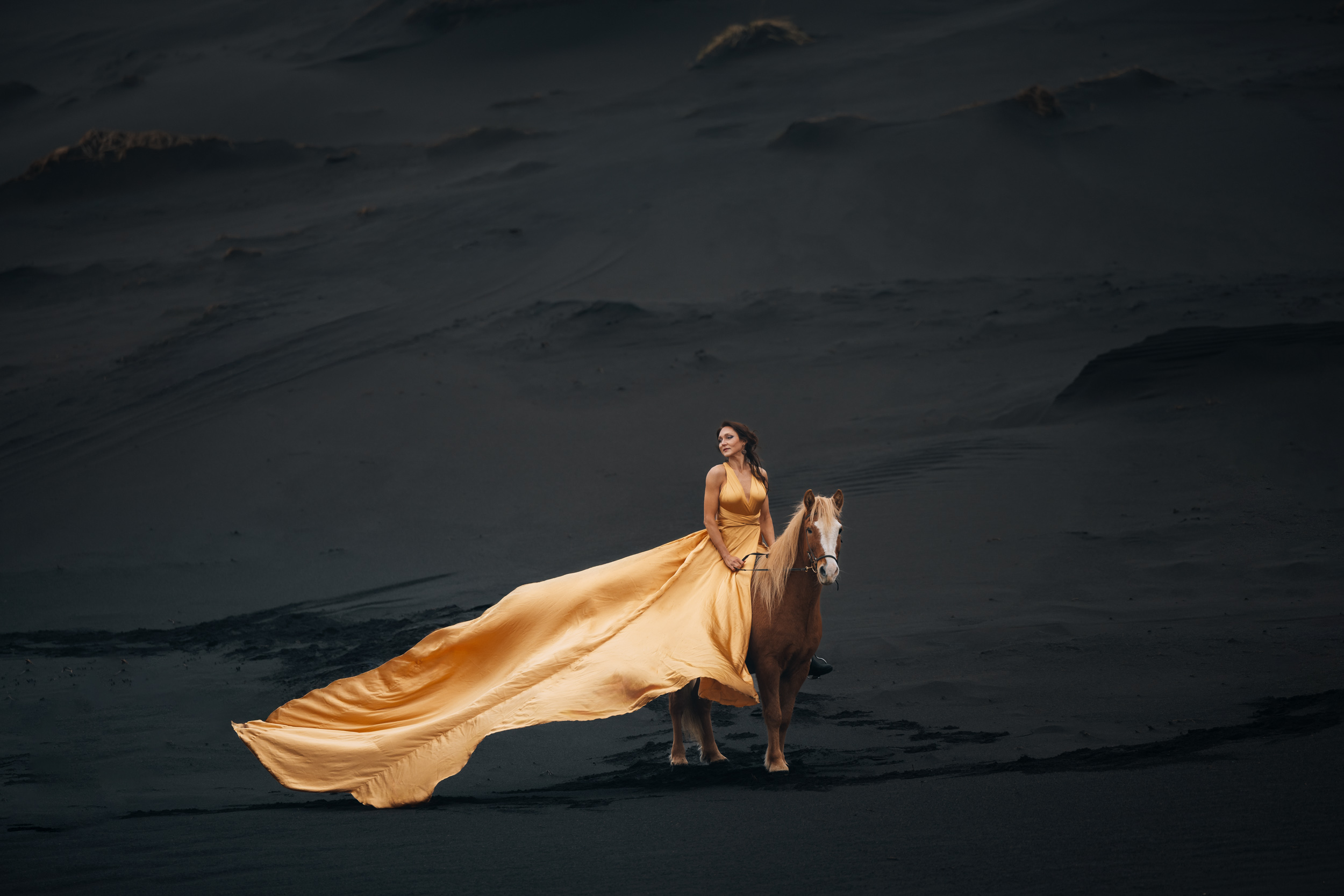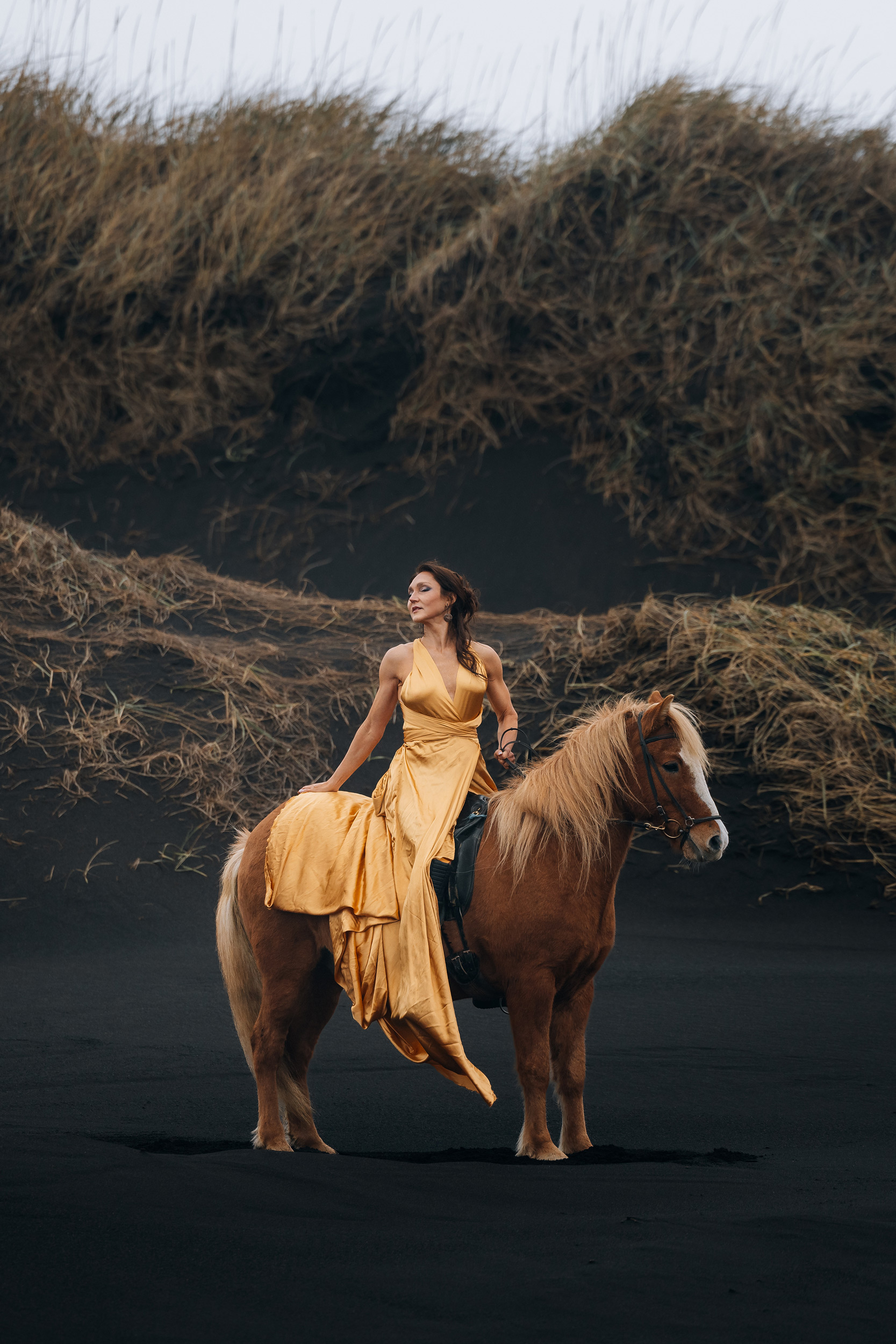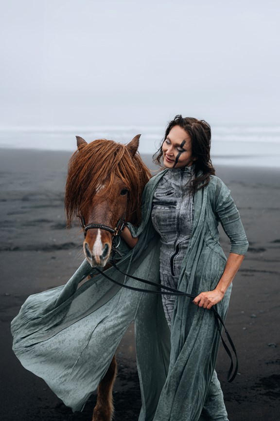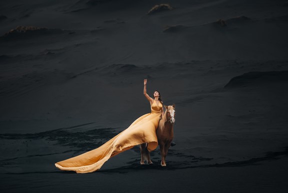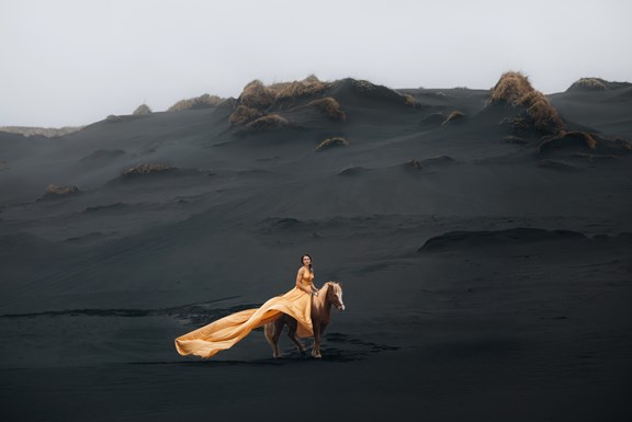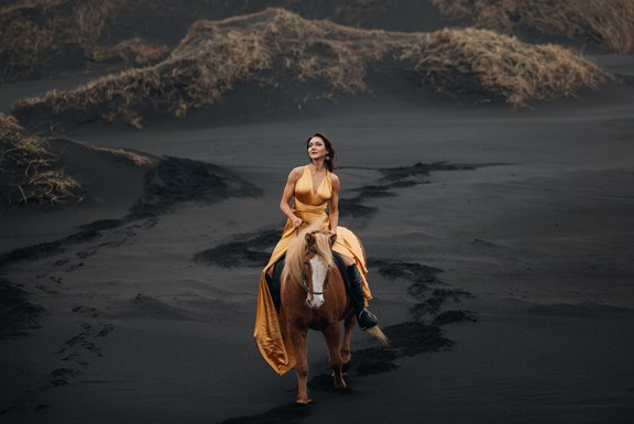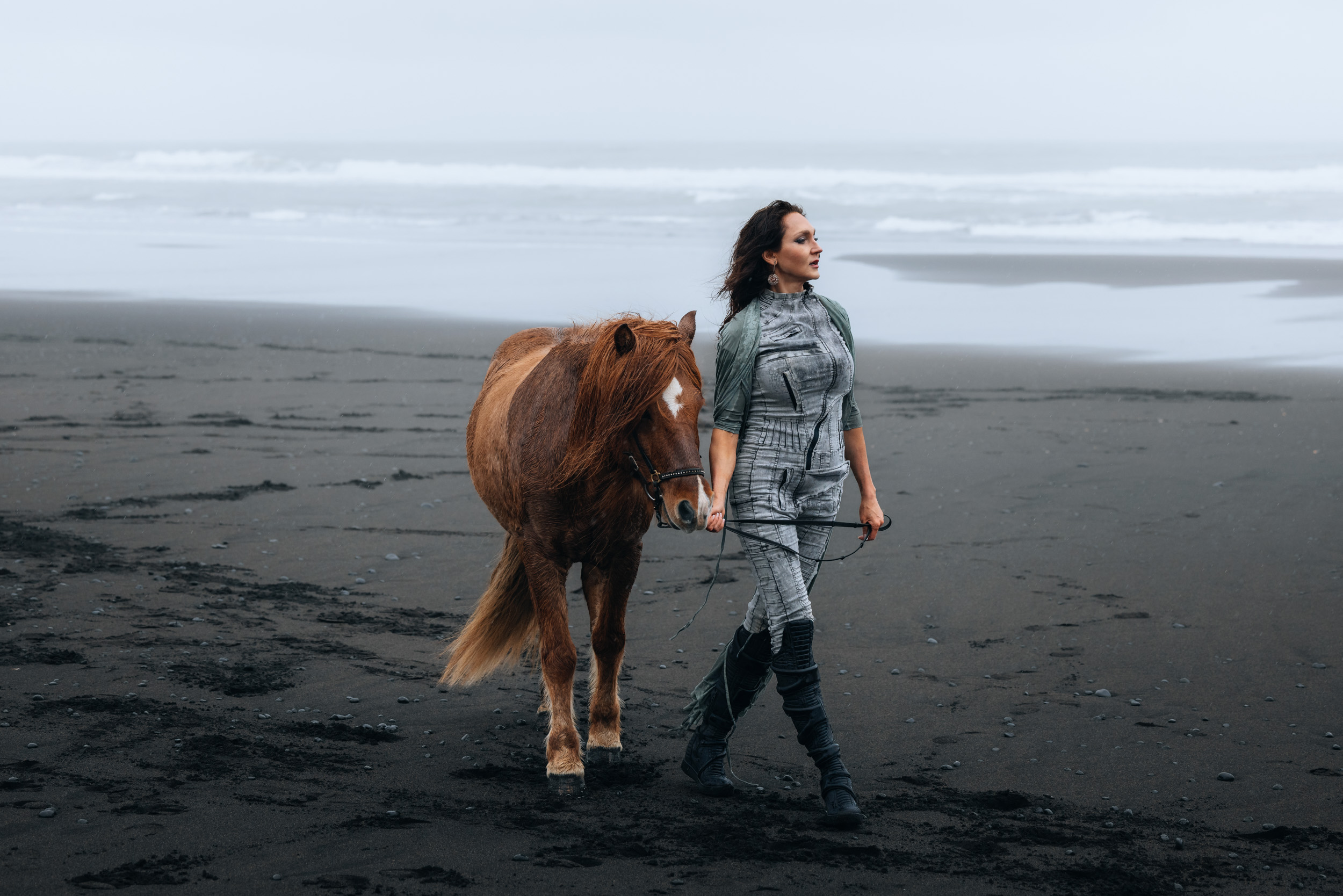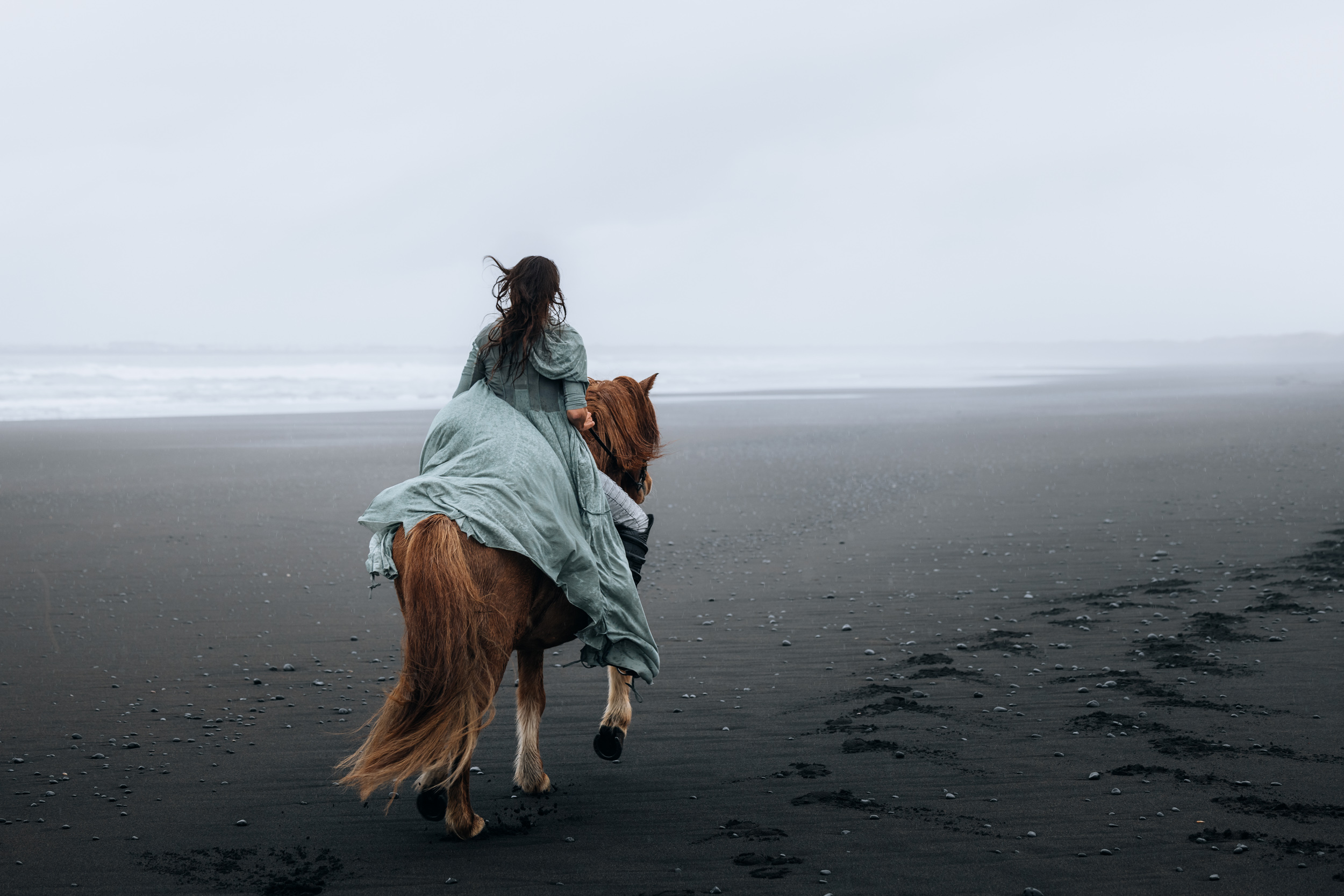 Irene had the idea to capture herself horseback riding on a black beach. Iceland’s wide open spaces, dark sand, and changing weather make it a perfect place for this kind of shoot. That day, the weather quickly turned, and heavy rain came pouring down. But instead of stopping, the shoot carried on, and the rain ended up making everything look even better, real, powerful, and full of atmosphere.