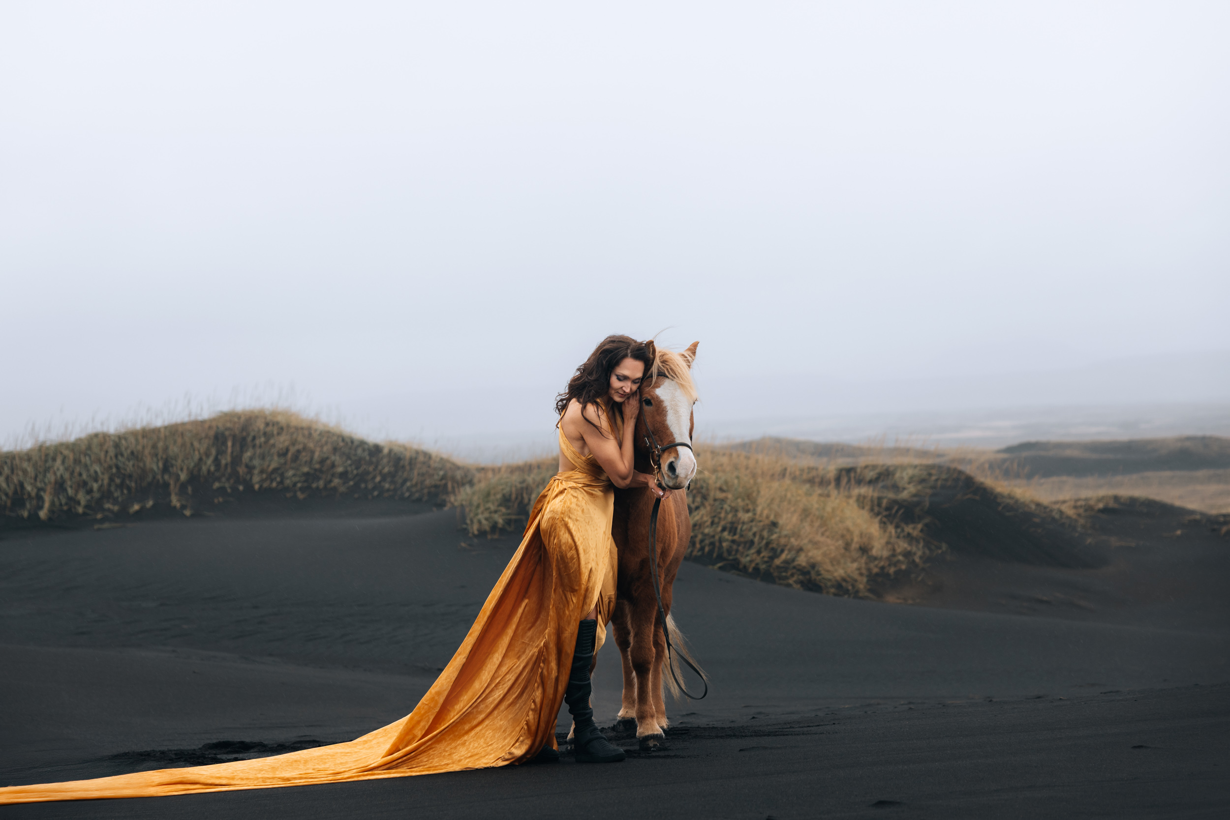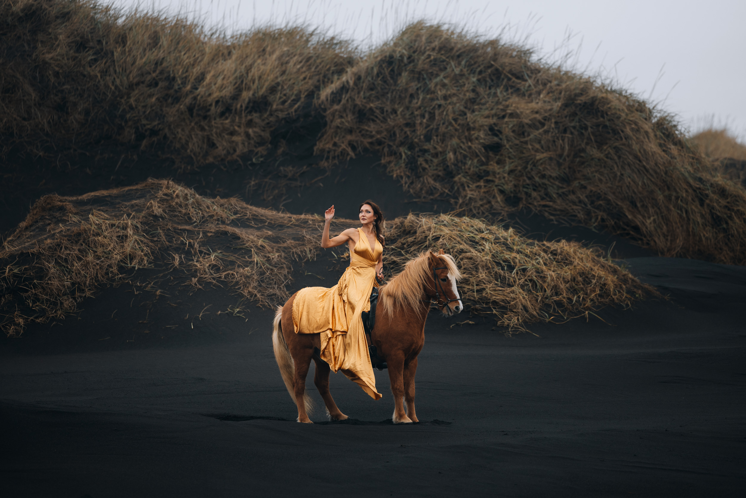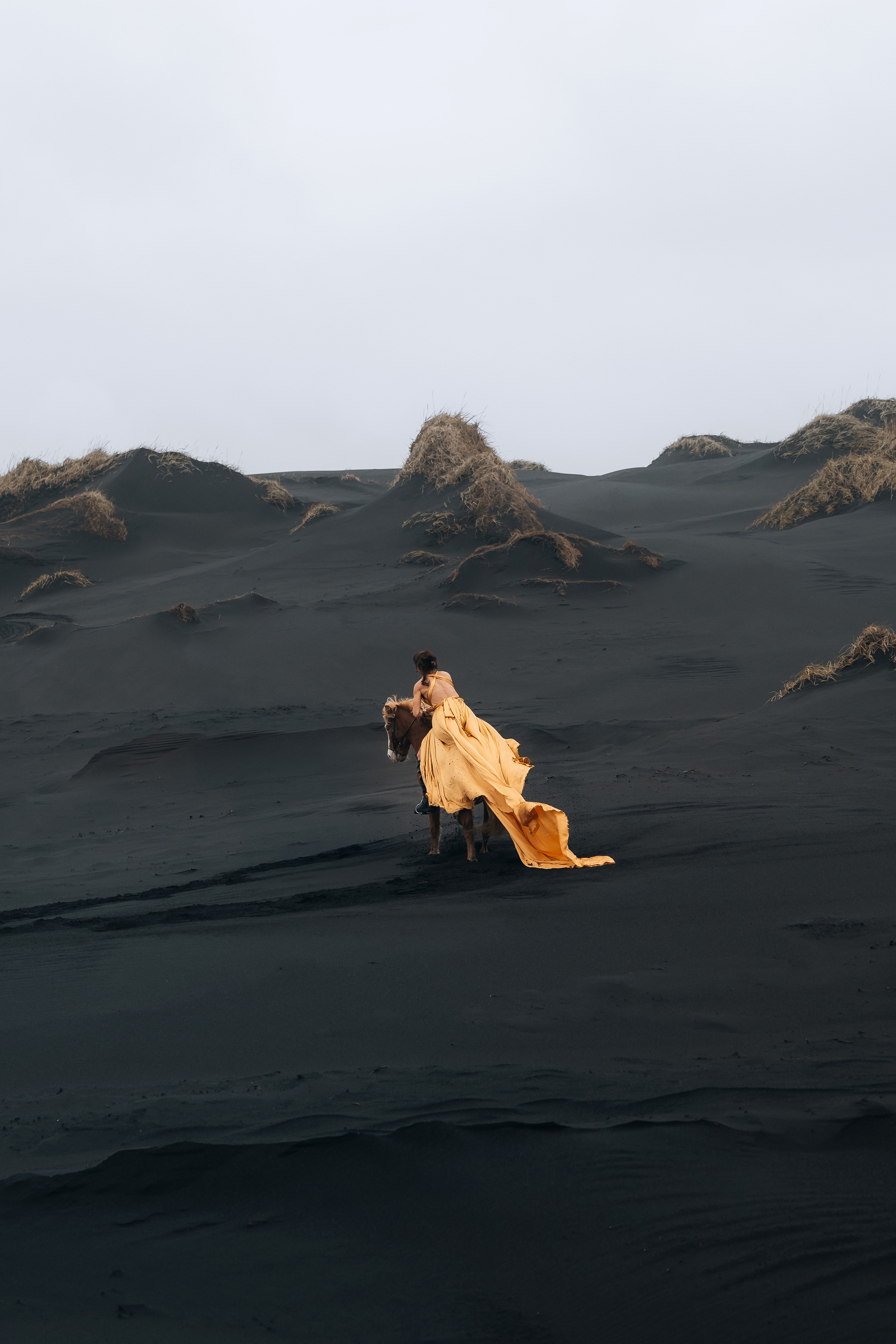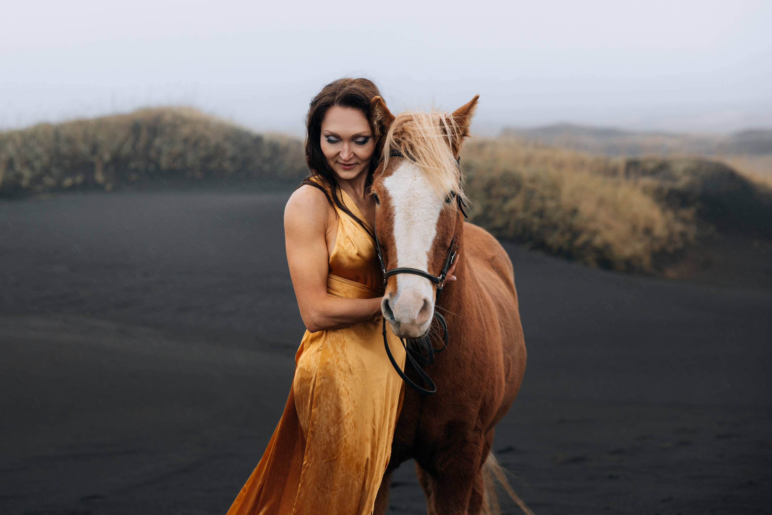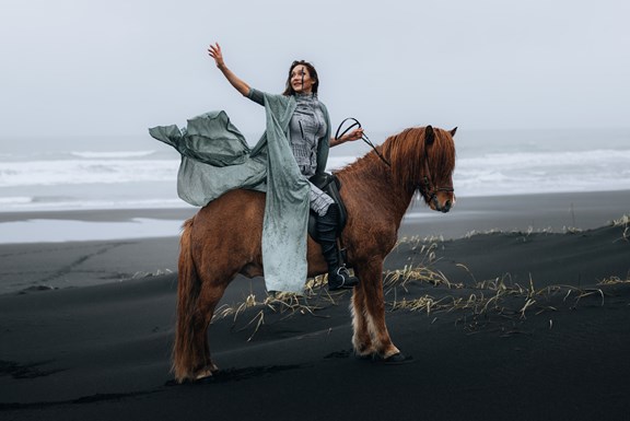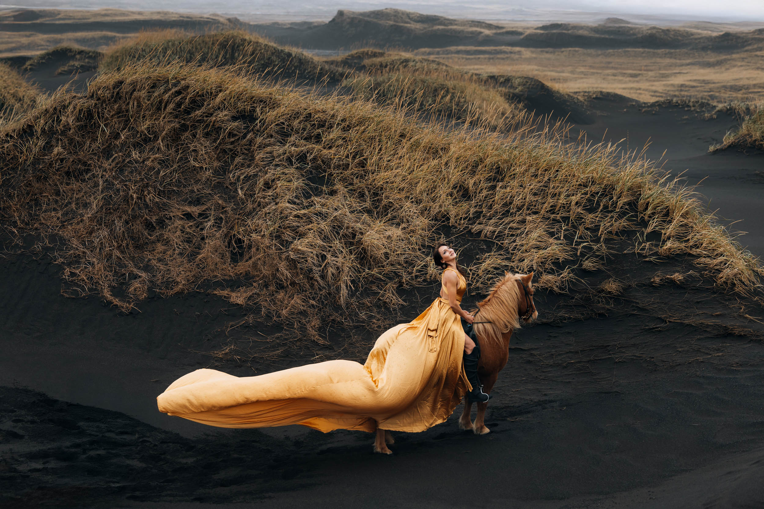 Irene had the idea to capture herself horseback riding on a black beach. Iceland’s wide open spaces, dark sand, and changing weather make it a perfect place for this kind of shoot. That day, the weather quickly turned, and heavy rain came pouring down. But instead of stopping, the shoot carried on, and the rain ended up making everything look even better, real, powerful, and full of atmosphere.
