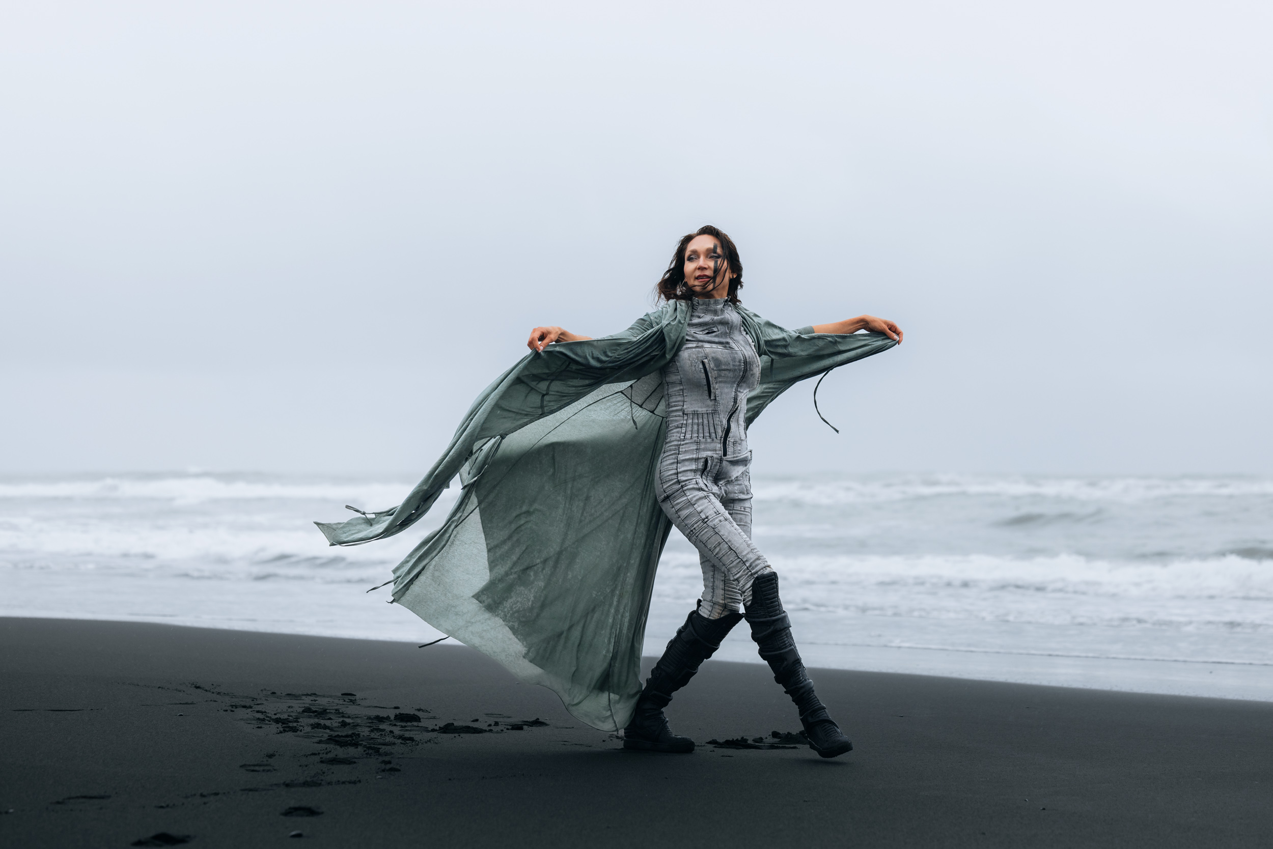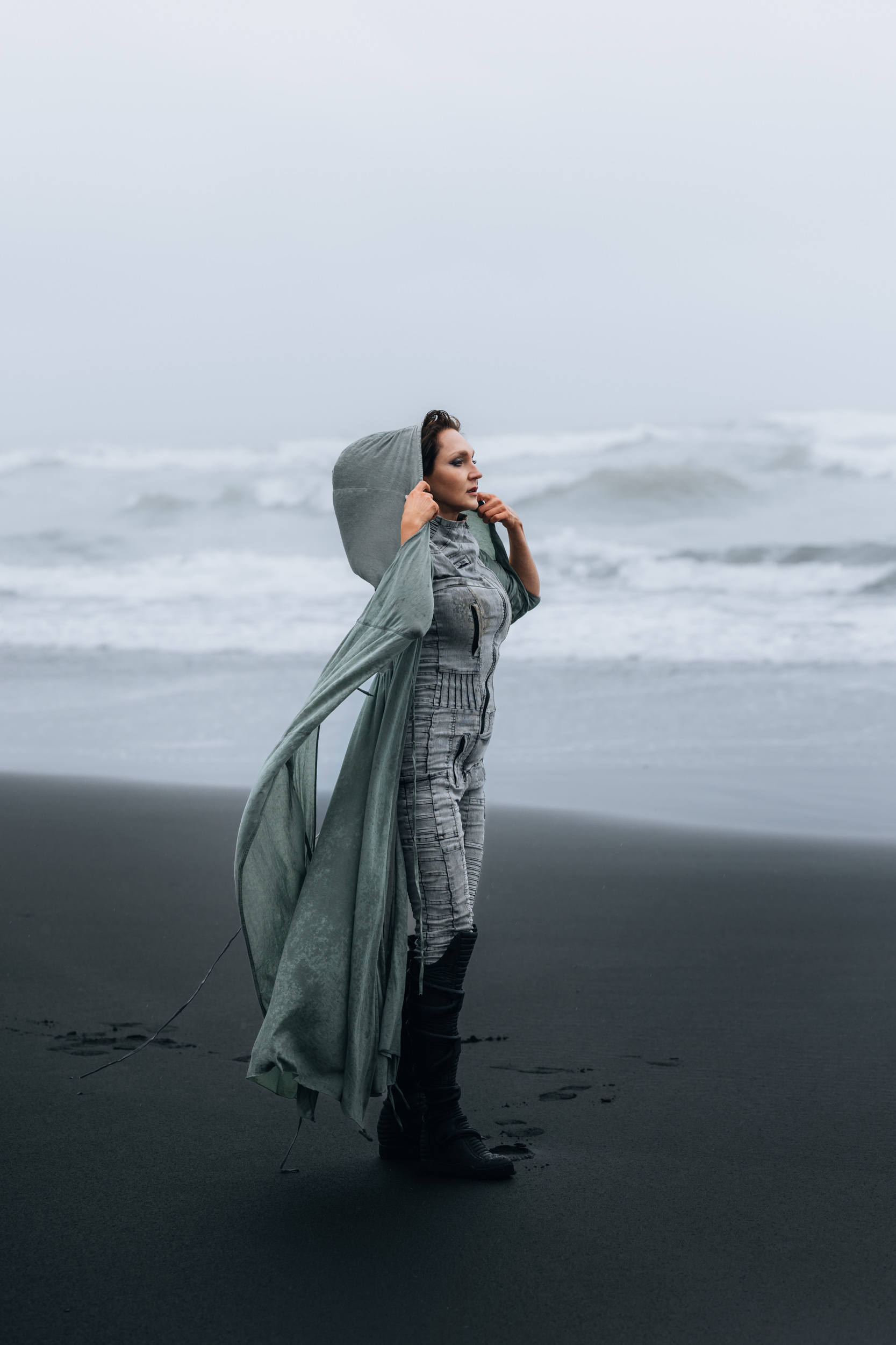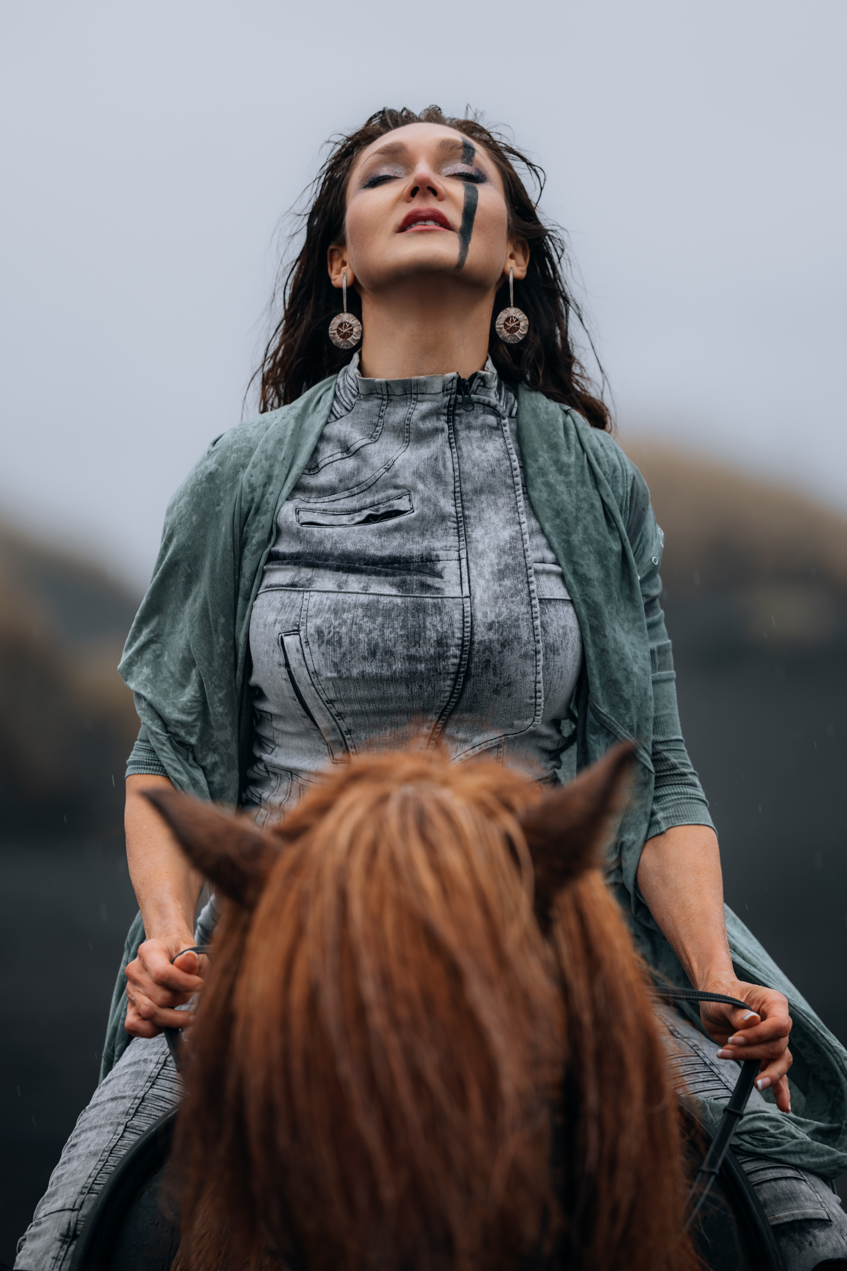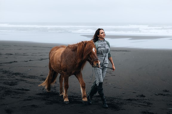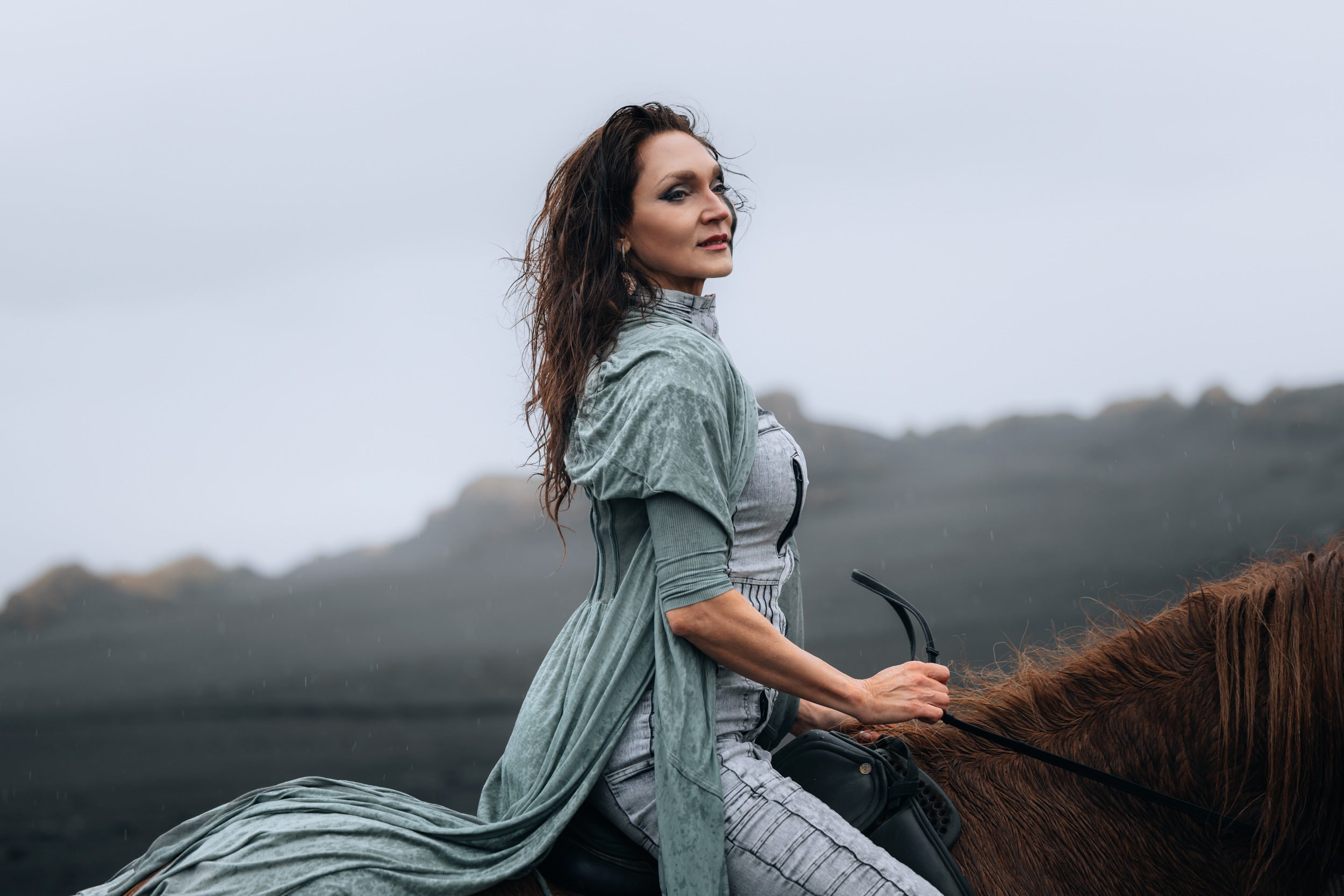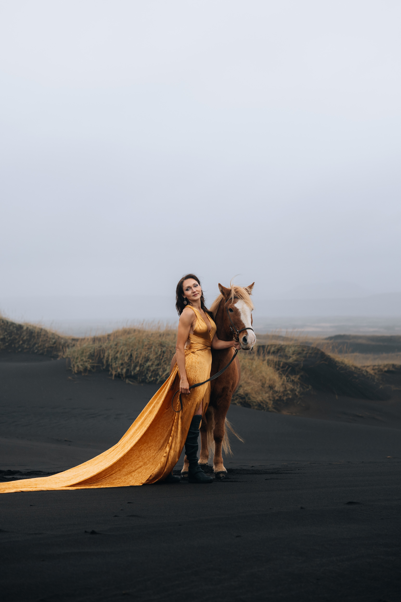 Irene had the idea to capture herself horseback riding on a black beach. Iceland’s wide open spaces, dark sand, and changing weather make it a perfect place for this kind of shoot. That day, the weather quickly turned, and heavy rain came pouring down. But instead of stopping, the shoot carried on, and the rain ended up making everything look even better, real, powerful, and full of atmosphere.