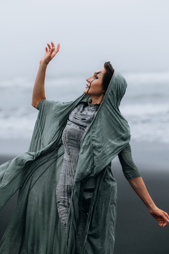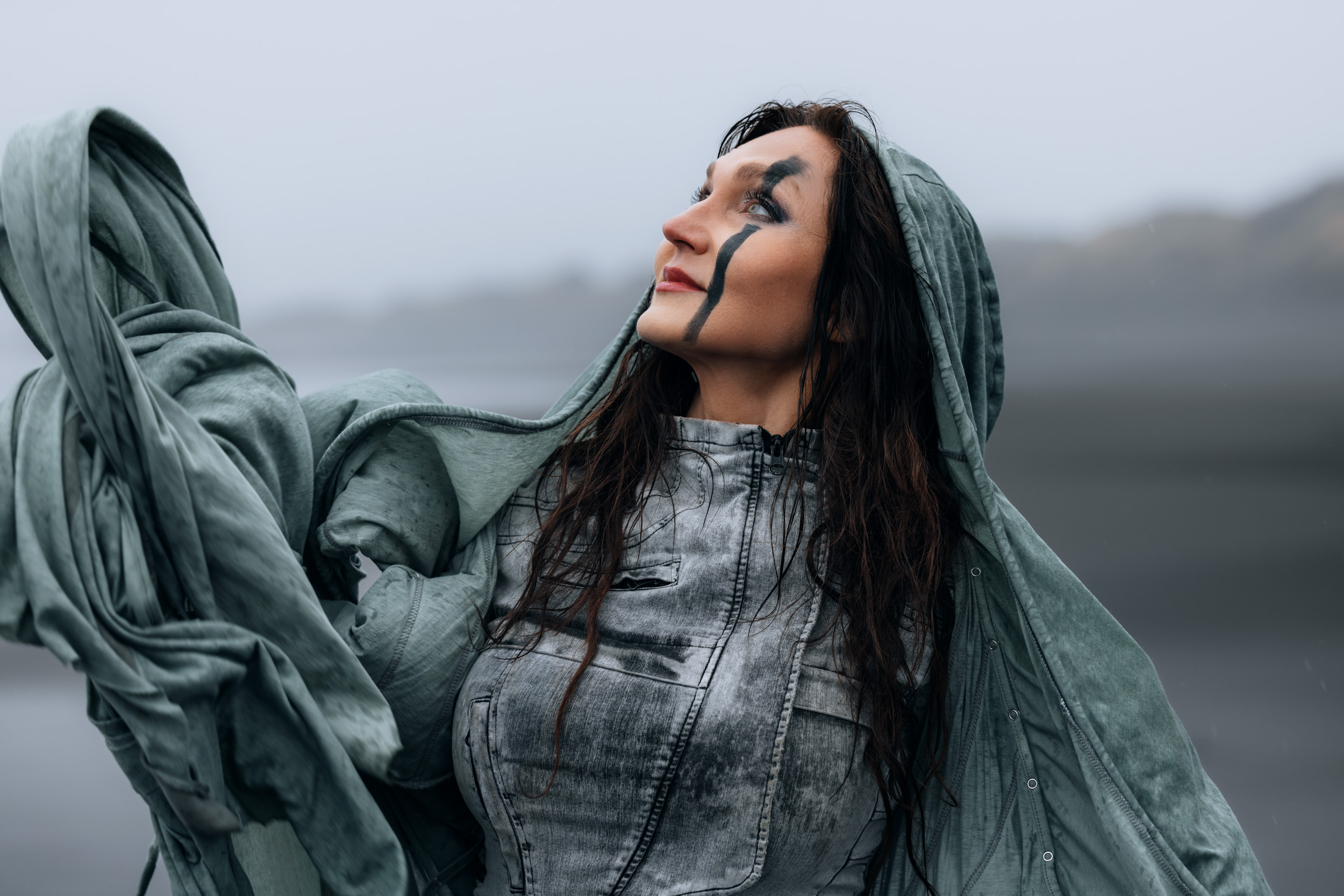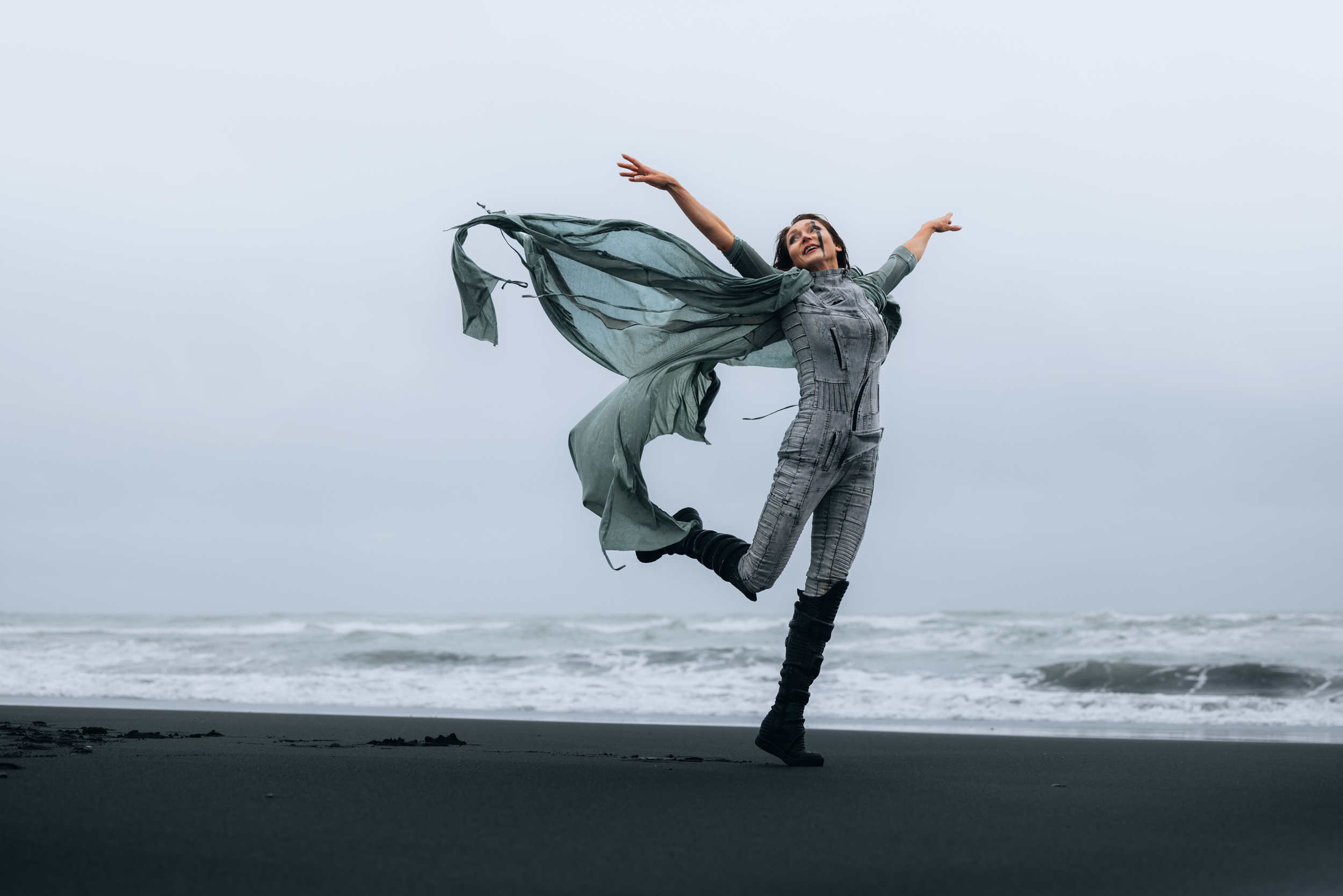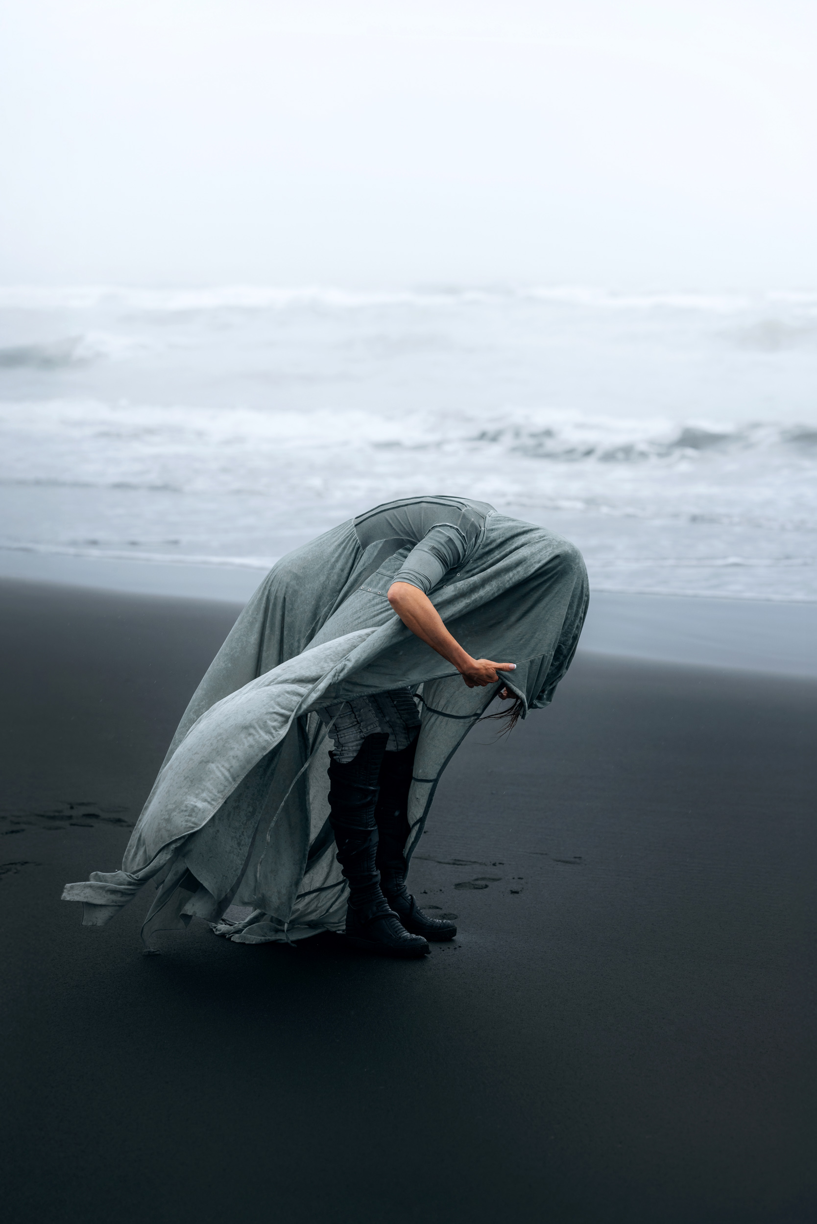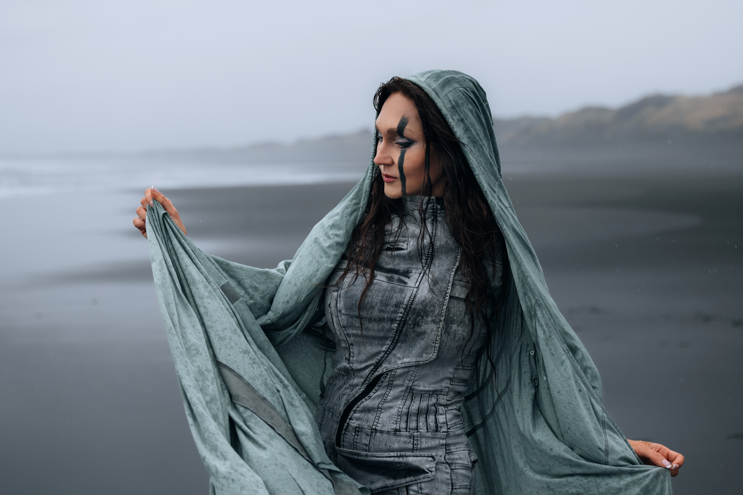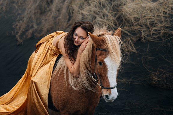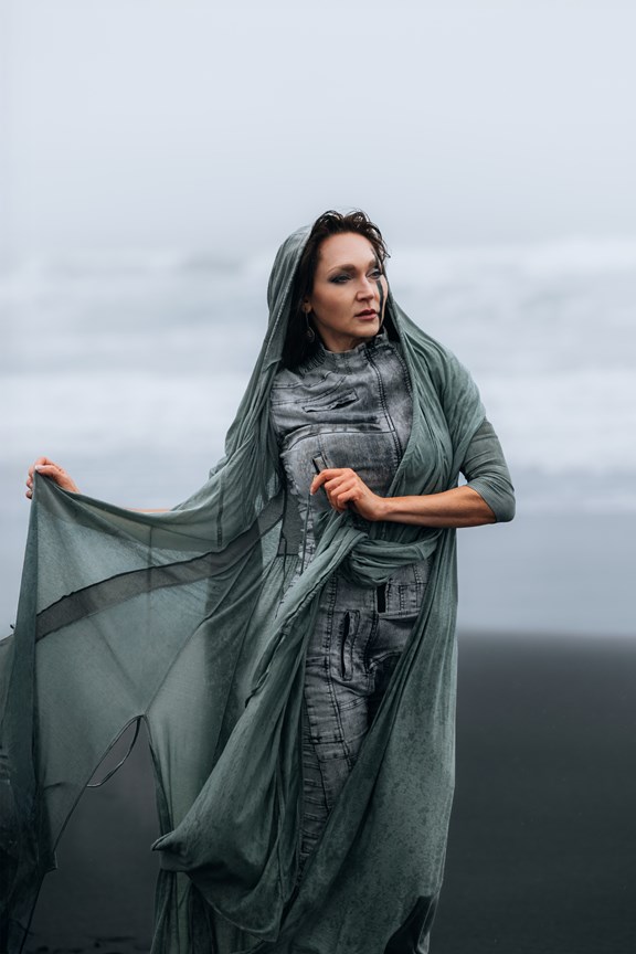 Irene had the idea to capture herself horseback riding on a black beach. Iceland’s wide open spaces, dark sand, and changing weather make it a perfect place for this kind of shoot. That day, the weather quickly turned, and heavy rain came pouring down. But instead of stopping, the shoot carried on, and the rain ended up making everything look even better, real, powerful, and full of atmosphere.